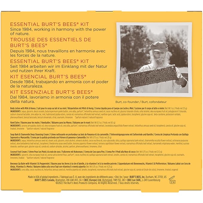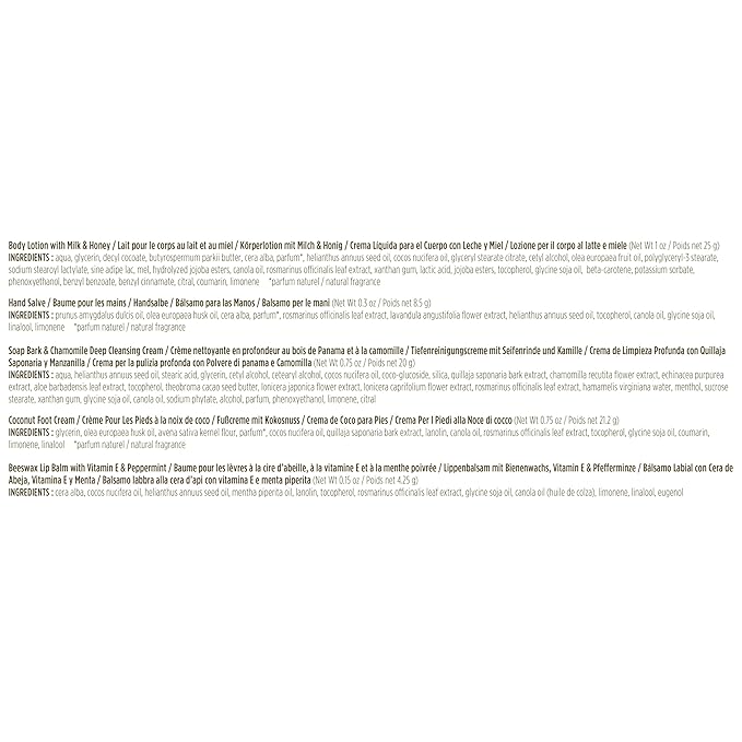 - SKIN CARE PRODUCTS: Pamper from head to toe with this giftable set including 5 travel size Burt's Bees favorites: Soap Bark and Chamomile Deep Cleansing Cream, Hand Salve, Milk & Honey Body Lotion, Coconut Foot Cream and Beeswax Lip Balm; Package may vary
