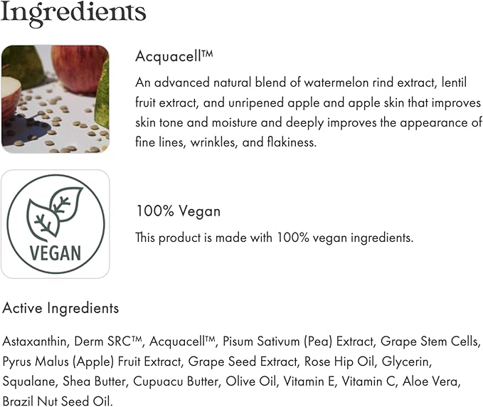 - Active Ingredients : vitamin_c, vitamin_e, Astaxanthin, Derm SRCโข, Acquacellโข, Pisum Sativum (Pea) Extract, Grape Stem Cells, Pyrus Malus (Apple) Fruit Extract, Grape Seed Extract, Rose Hip Oil, Glycerin, Squalane, Shea Butter, Cupuacu Butter, Olive Oil, Vitamin E, Vitamin C, Aloe Vera, Brazil Nut Seed Oil. vitamin_c, vitamin_e, Astaxanthin, Derm SRCโข, Acquacellโข, Pisum Sativum (Pea) Extract, Grape Stem Cells, Pyrus Malus (Apple) Fruit Extract, Grape Seed Extraโฆ See more