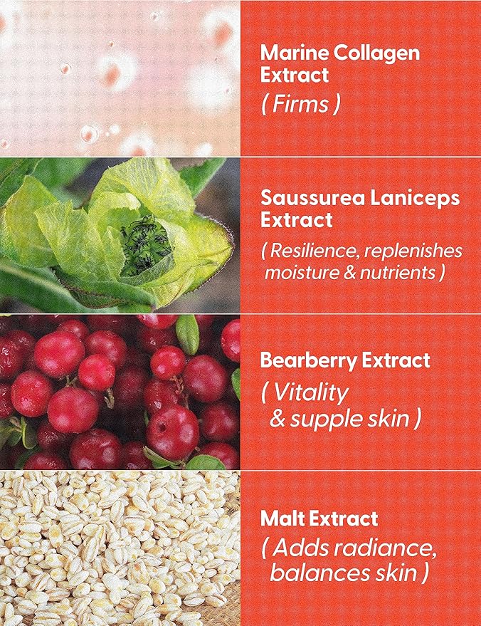 - CLEANSING AND FIRMING FACE TONER. This face toner for aging skin contains skin firming Collagen Extract and Saussurea laniceps Extract, which moisturize and cleanse the skin, and Malt Extract and Bearberry Extract that is high in various amino acids, which provide antioxidants benefits & restore vitality and suppleness.