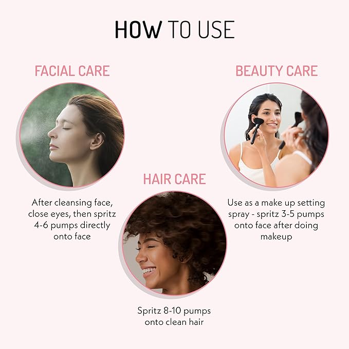 - Hair Treatment - Use as a styling and conditioner spray, tame frizzy hair & add a glowing shine to hair. Beauty water and hydrating mist for every day hair and face care .