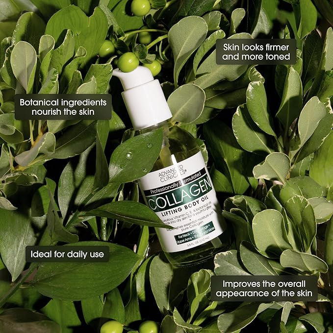 - COLLAGEN BODY OIL WITH VITAMIN E, BOTANICALS, & VITAMIN C - Hydrates and nourishes while helping to visibly firm and smooth the look of skin. This antioxidant-rich blend supports a more even-looking tone and enhances skinโs softness and radiance. This luxurious yet lightweight body oil glides over skin to help lock in moisture and visibly smooth texture. Ideal for anyone who is looking to enhance their skincare beauty routine.