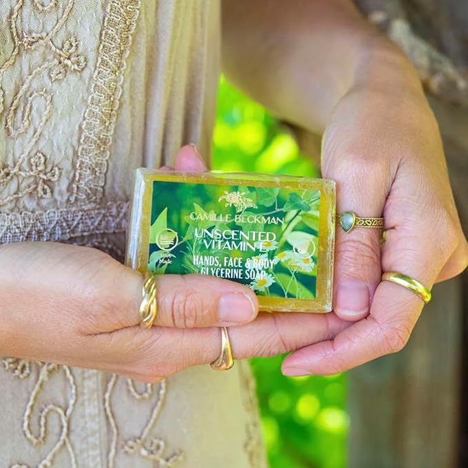 Camille Beckman Essentials Gift Basket, Vitamin E Unscented, Glycerine Hand Therapy 6 oz, Silky Body Cream 13 oz, Hand and Shower Cleansing Gel 13 oz, Glycerine Soap 3.5 oz