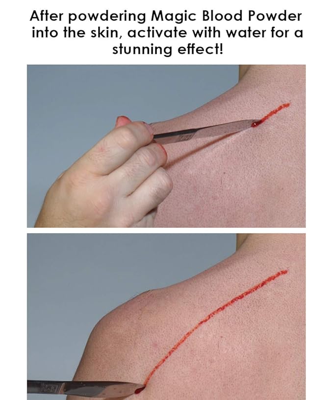- Magic Blood Powder: A water-activated powder that when applied is invisible, but when sprayed with water looks like the result of a motor cycle accident. Drag a dull wet prop knife across powdered skin for a bloody cutting effect.