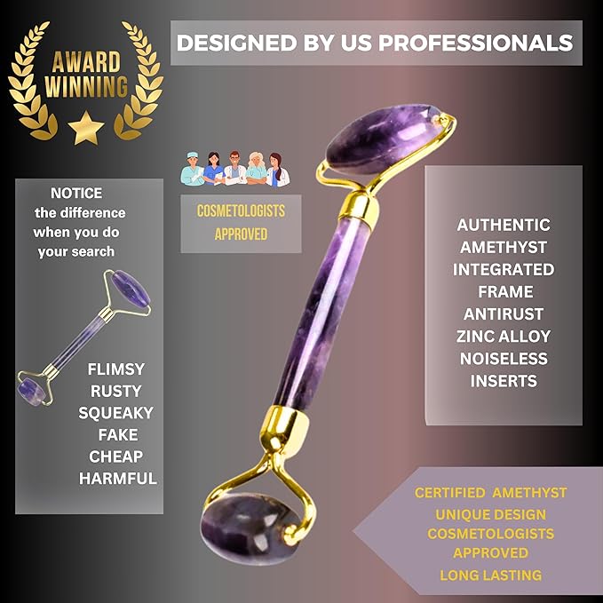 - Bonus Amethyst Guasha & Jade Roller - Noisless & Smooth USA Quality : Weโve seen those Jade Rollers too, you know the ones that squeak and break. This, is not those.But we use a hard, stainless steel integrated frame (all one piece) and two tiny โwheelsโ that we insert in the head of the roller which turns your roller smoothly and without a noice..