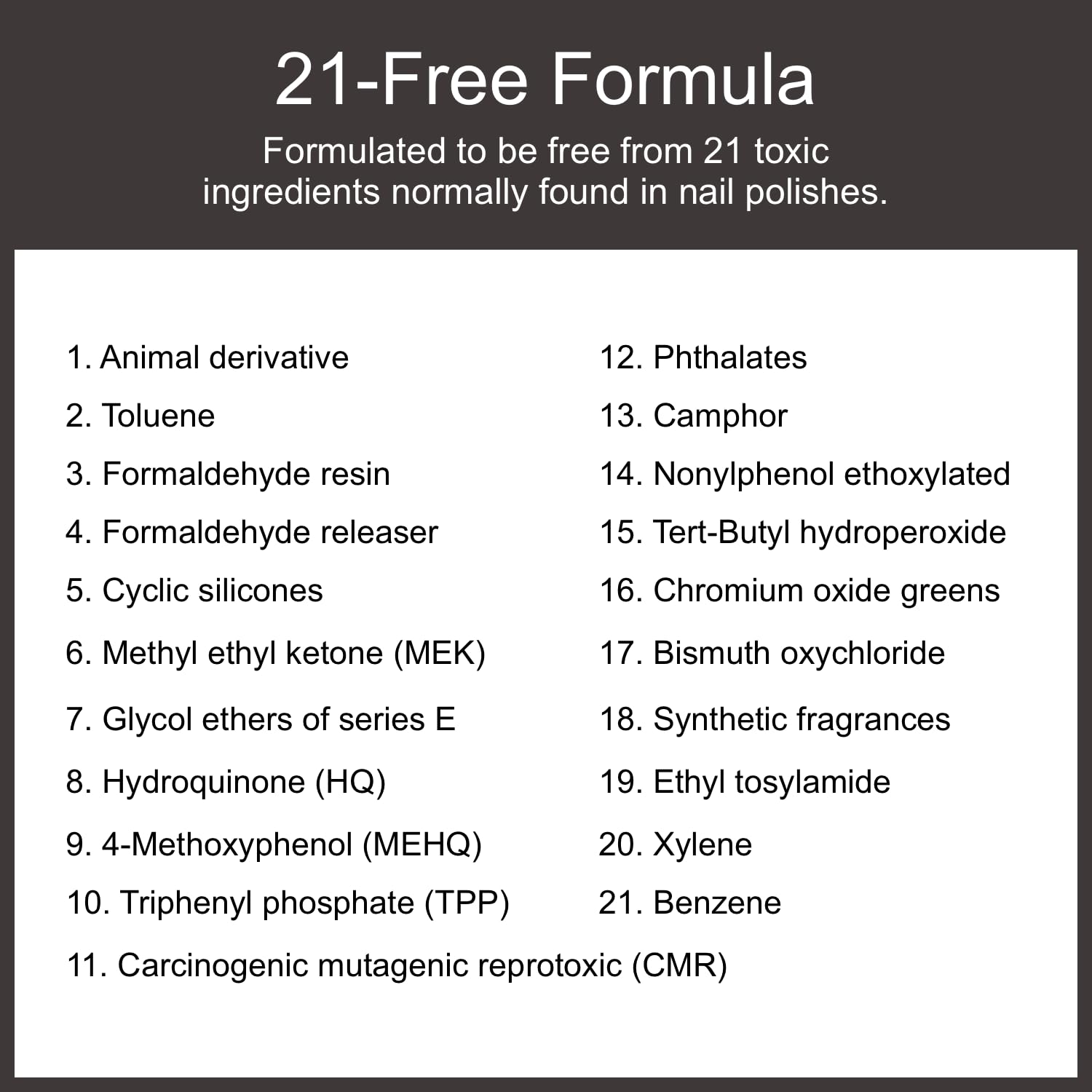 - BENEFITS: Our vegan nail polish delivers even nail coverage, rich color, and long-lasting wear, while promoting stronger, healthier nails. Formulated to be free from 21 toxic ingredients normally found in nail polishes.