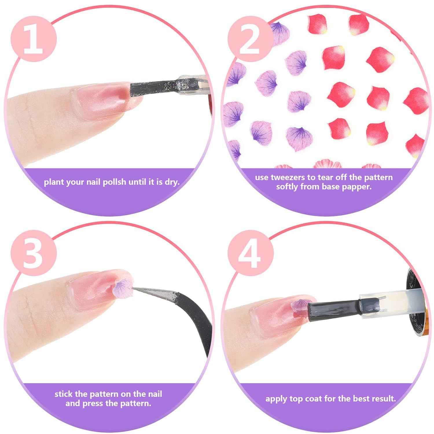 - Easy application: the multi-design flower nail stickers are self-adhesive and convenient to use and remove, just apply a layer of base coat, choose the designs and colors you like, then paste the flower stickers on your nails and press to make them stable, which is easy and takes little time
