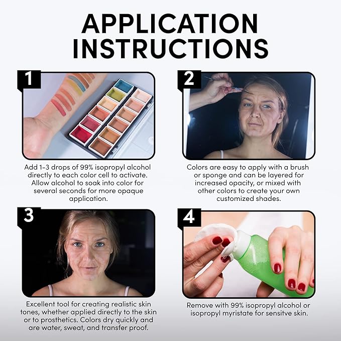 - REALISTIC SFX MAKEUP: Create realistic skin tones and textures, such as wrinkles, scars, and other effects, directly to the skin or prosthetics.