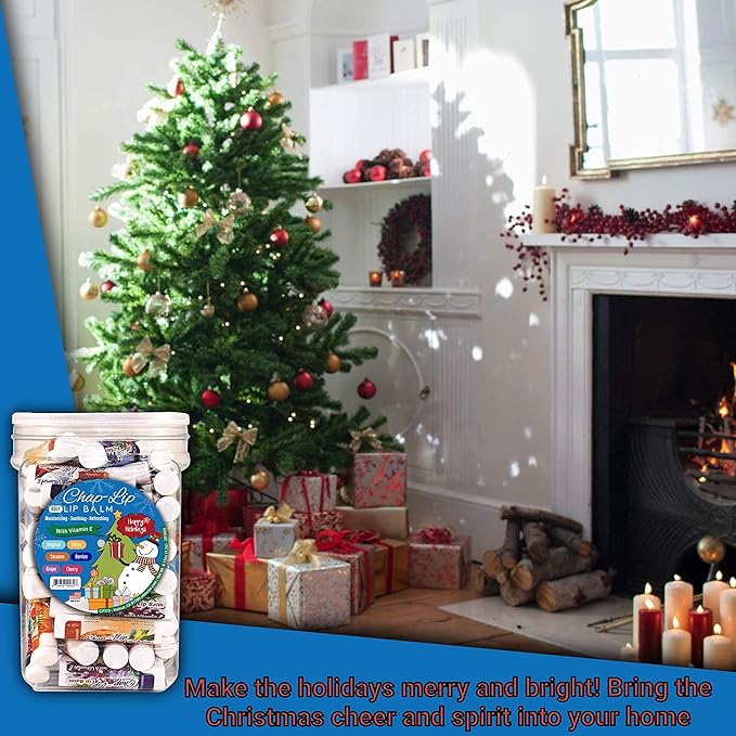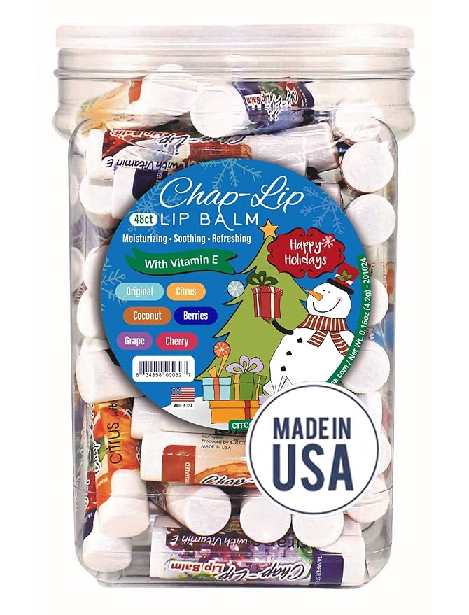- HOLIDAY THEMED LIP BALM - Same great variety of 6 refreshing flavors, 8 from each: Grape, Cherries, Original, Berries, Citrus, & Coconut, packed in a holiday-themed jar. The flavors are subtle but unmistakably refreshing. These flavors help moisturize and soothe your lips