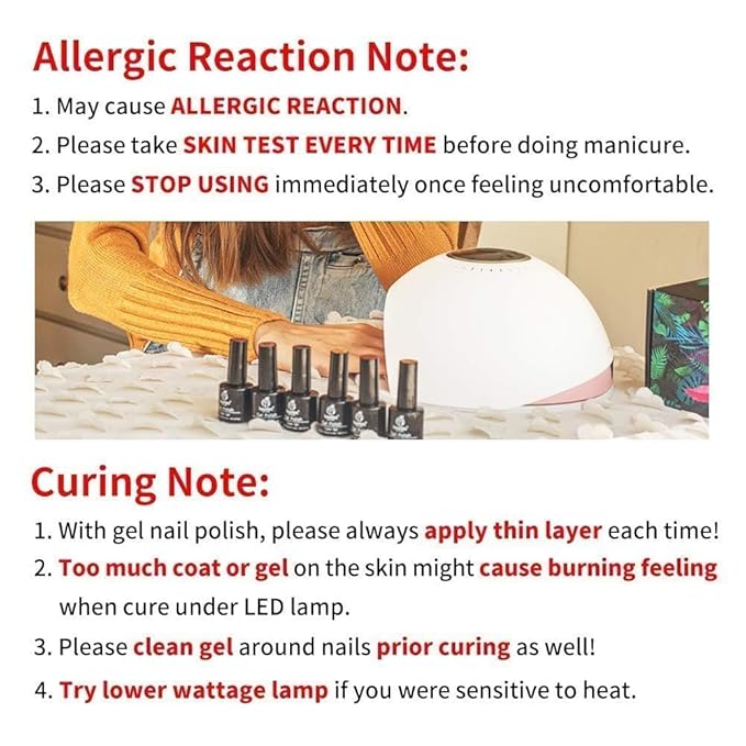 - WARNING: May cause an allergic reaction. If you have sensitive skin, we recommend using this item in combination with Liquid Peel off Latex Tape. The Liquid Peel off Latex Tape can help minimize direct contact between the gel and your skin, reducing the likelihood of allergic reactions. Additionally, the spill-proof adhesive can assist in achieving better nail art results. Please note that this product does not include Liquid Peel Off Latex Tape, which needs to be purchased separately.