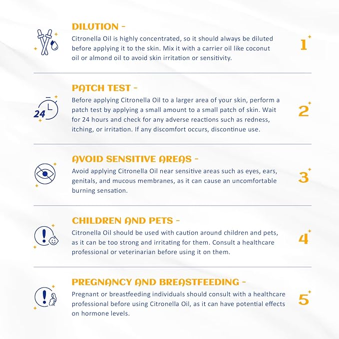- Safety Warning: Before using citronella essential oil, please perform a patch test to ensure no allergic reactions occur. Due to the high concentration of citronella essential oil, it is recommended to dilute it before use to avoid skin irritation