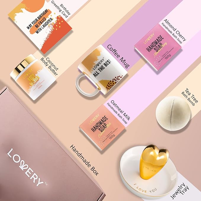 - SELF CARE GIFTS FOR WOMEN โ This Stress Relief Gifts is Handmade and includes Coconut Body Butter, Oatmeal Milk Handmade Bath Soap, Almond Cherry Handmade Bath Soap, Tea Tree Bath Bomb, Mug saying โALL THE BESTโ, Jewelry Tray saying โI LOVE YOUโ, & Personalized Greeting Card saying โMAY YOUR BIRTHDAY BE FILLED WITH LAUGHTERโ, wrapped with confetti in a handmade box ready for gifting and last minute gifts.