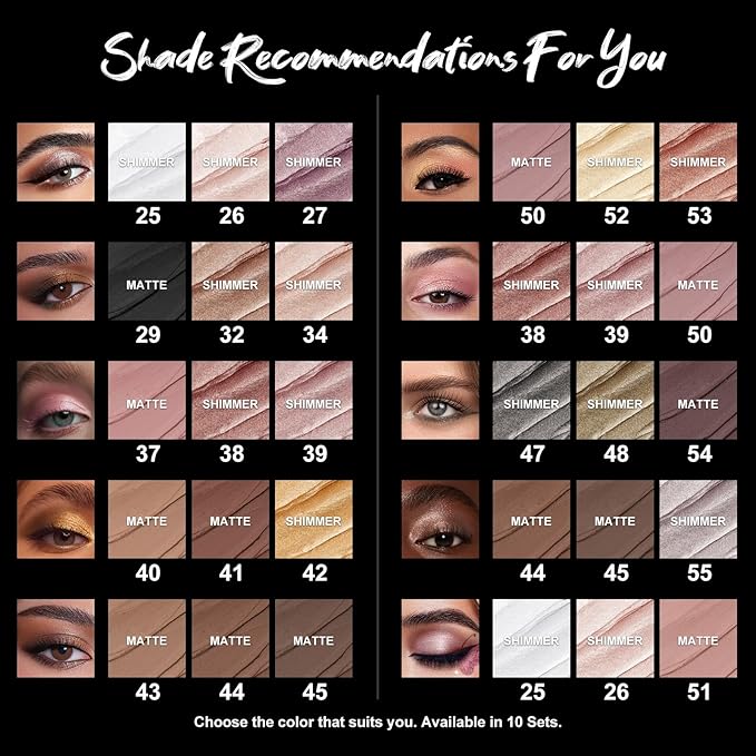 - 【Matte And Shimmer Eyeshadow Stick】Highly pigmented eyeshadow stick set,from light to dark color,can be used to give smoky,luminous and metallic makeup.Shimmer and matte cream eyeshadow sticks would create flawless eyes makeup for your different dressing styles and occasions.