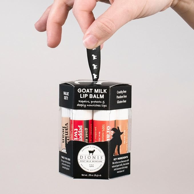 Dionis Goat Milk 6 Pc Lip Balm Ornament - Vanilla, Coconut, Milk & Honey, Berry, Peppermint & Blood Orange Scented Chapstick - Shea Butter & Coconut Oil, Protect & Restore Lips 0.28oz