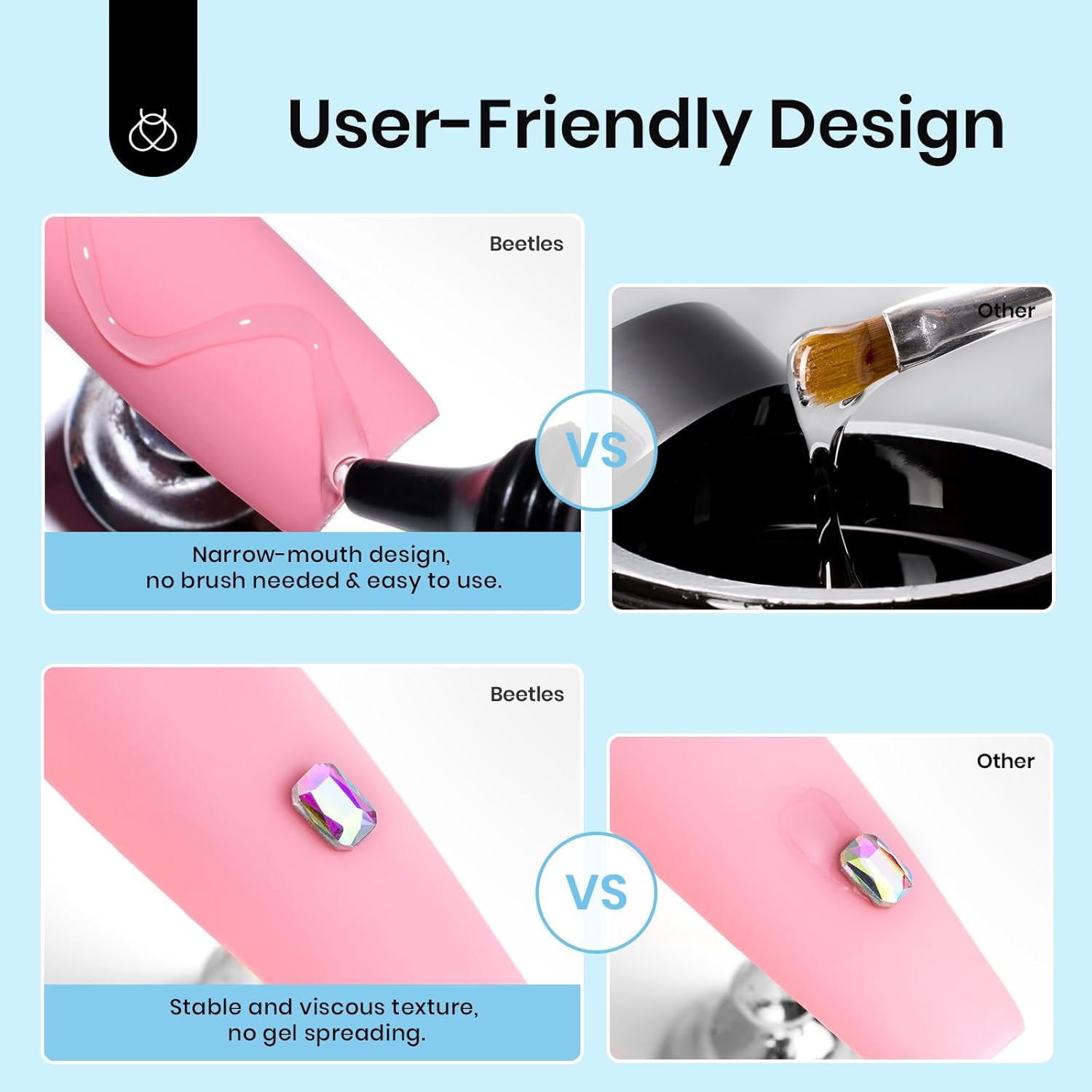 - Super Strong Adhesive Nail Gems Glue Gel: (LED required) Beetles rhinestone gel glue is made from natural resin and is perfect for the decoration of nail gems, jewels, beads, and nail rhinestones. Super adhesive, it won't fall off easily! Breathable and with no unpleasant odor, no harm to skin and nail, suitable for natural and artificial nails, press-on nails, gel nail polish nails, poly nail gel, acrylic powder, or nail tips.