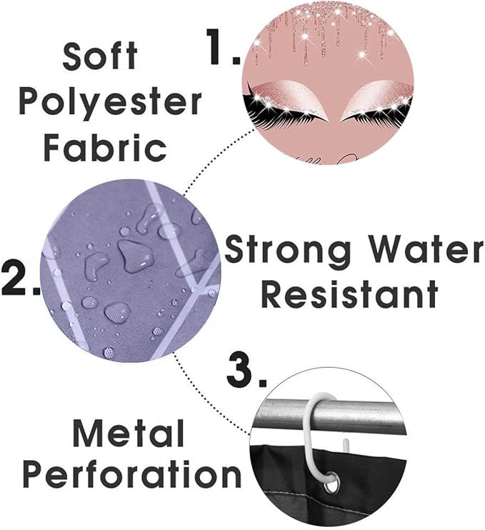 4PCS Hello Gorgeous Shower Curtain Set, Eyelash Makeup Glam Fashion Girly Pink Bathroom Decor for Women Girls, Waterproof Fabric Shower Curtain, Non-Slip Bath Mat Toilet Rug, Rose Gold Glitter
