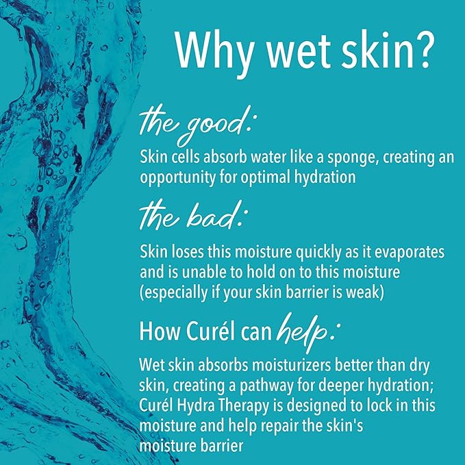- DRY SKIN NOURISHMENT - Our Curel Hydra Therapy moisturizer is activated by water on freshly-showered skin. It penetrates into the skin surface helping to repair the moisture barrier