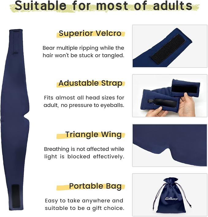 - Large Size & Adjustable: The eyemask is with Large Size to fit most head circumference and side-sleepers. You may adjust the strap to your suitable length via the Velcro, and the mask will no shift off easily. You wonโt feel any pressure on your face or your eye balls with this sleep face mask, and we believe that you will want to use it in the long term