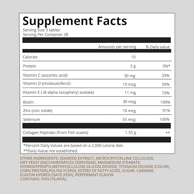 - Ingredients - seaweed extract, microcrystalline cellulose, dry yeast (saccharomyces cerevisiae), magnesium stearate, hydroxypropyl methylcellulose, silicon dioxide, titanium dioxide (color), corn protein, polyglycerol esters of fatty acids, sugar, carmine, elastin hydrolysate (fish), peppermint flavor.