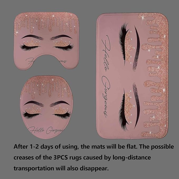 4PCS Hello Gorgeous Shower Curtain Set, Rose Gold Glitter Drip Bling Glam Diamond Crown Princess Unicorn Eyelash Girls Pink Bathroom Decor, Waterproof Fabric Shower Curtain Bath Mat Toilet Rug