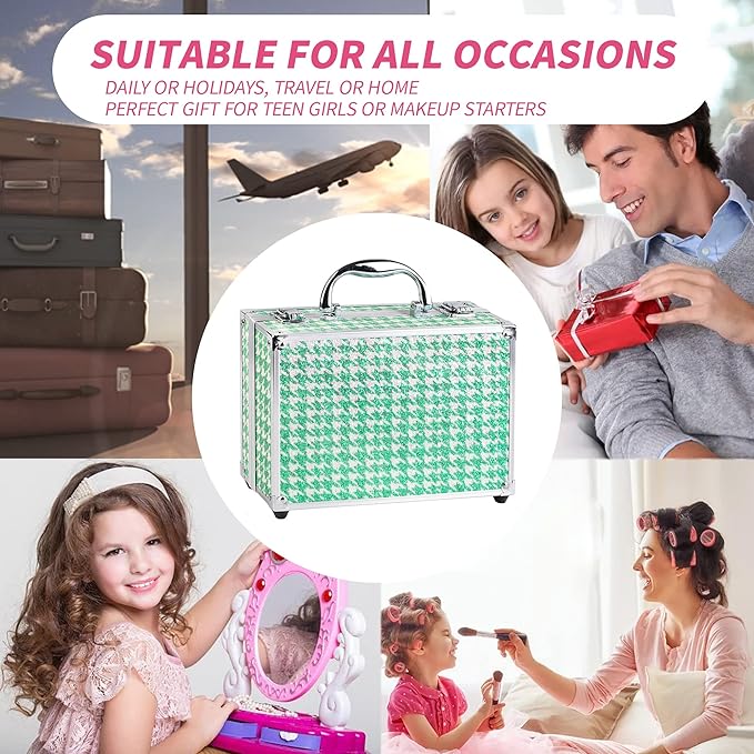 - Chic Sturdy Aluminum Organizer: The makeup train case, which is durable and spacious, comes in cute green houndstooth pattern surface and is made with reinforced aluminum frames for extra durability and protective. Portable Size: 9.84 x 6.7 x 3.54 inches
