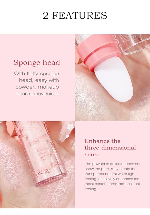 - 【AKARY Multi-use Shimmer Highlighter & Blush Powder】The shimmer highlighter powder is not just a highlighter, but a blush too. It can be used not only on the face but also on the clavicle, eye, body, lip, and hair, use it anywhere you want to apply, the highlighter to make the skin shimmer and sparkle, with light-diffusing pigments and instant sponge head design to enhance and perfect skin. Natural 3D brightening and beautifying powder blush high-gloss powder, suitable for all skin tones.