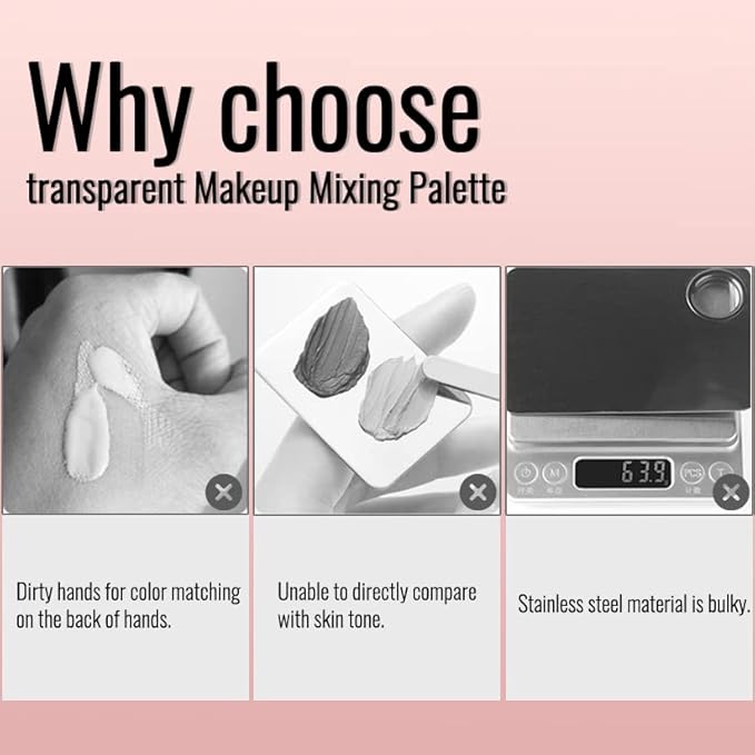 - 【PROFESSIONAL MAKEUP MIXING PALETTE】 The fully transparent color palette allows you to see whether the mixed color is consistent with your skin during makeup. With eye shadow and lip gloss color test areas on both sides of the product, you can quickly select colors to avoid repeated color tests and color-matching errors.