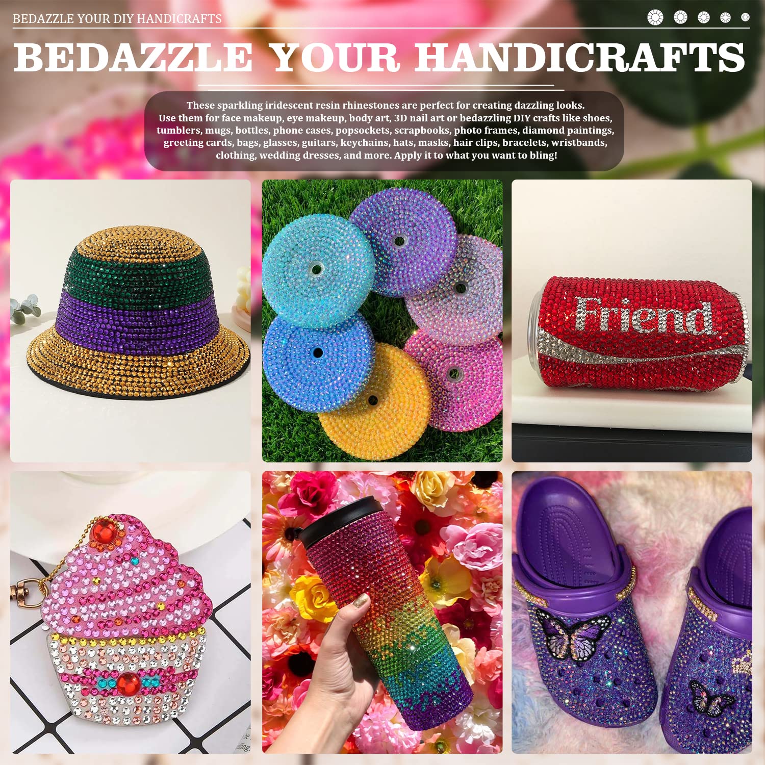 - đź’ŽWIDE APPLICATION -- These sparkling iridescent resin rhinestones are perfect for creating dazzling looks. Use them for face makeup, eye makeup, body art, 3D nail art or bedazzling DIY crafts like shoes, tumblers, mugs, bottles, phone cases, popsockets, scrapbooks, photo frames, diamond paintings, greeting cards, bags, glasses, guitars, keychains, hats, masks, hair clips, bracelets, wristbands, clothing, wedding dresses, and more. Apply it to what you want to bling!