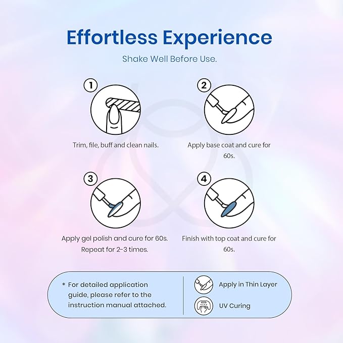 - 【Easy Application & Good Tenacity】The series of gel nail polish set is long lasting for 28+ days. Need to be cured under LED Dryer Lamp. Base and Top coat are required. Average for LED Lamp 60-120 secs.This item is UV gel. It is still sticky after curing. It must be used with a base coat and top coat! This item does not include base&top coat, which needs to be purchased separately.