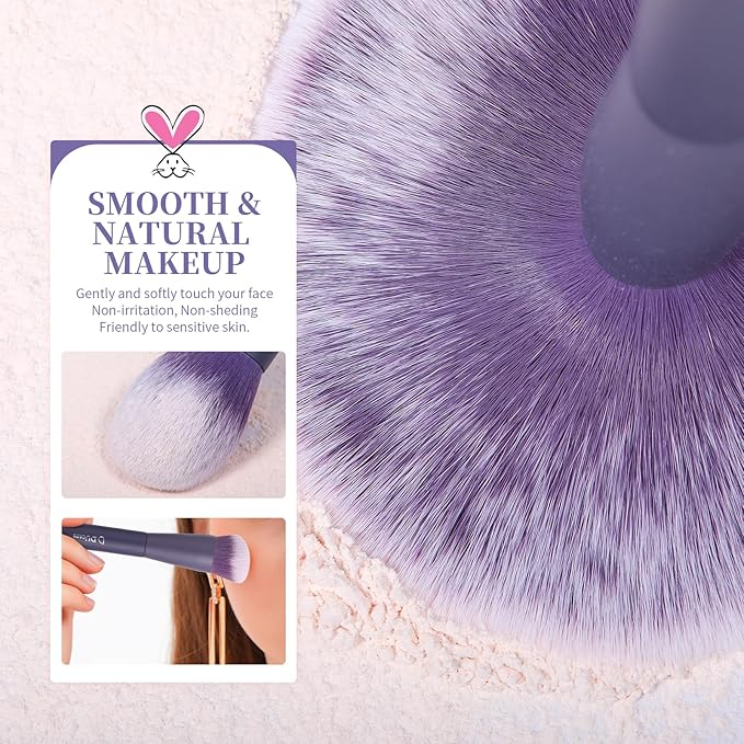 - đź’śElegant Design, Excellent Gift: Stunning Luxury Purple handles paired with soft synthetic bristles create a visually striking, high-end aesthetic. The curved design elevates its luxurious appeal. Designed for gifting, this brush set arrives in a gift box perfect for holidays like Christmas, Valentine's Day, Mother's Day, New Year, or Thanksgiving Day. It's a thoughtful gift for women, girls, makeup lovers, brides, or beauty enthusiasts who value style and ethics.