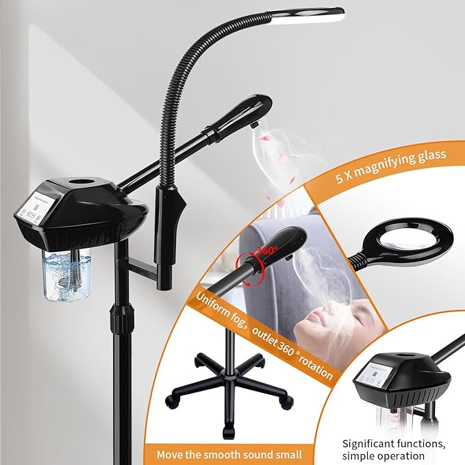 - ⭐【5 X magnifying glass】–The face steamer carries a magnifying glass looking better at the skin during the client's face or skin care,You can adjust the height and direction of the magnifying glass at will, which can play a great role in your work!