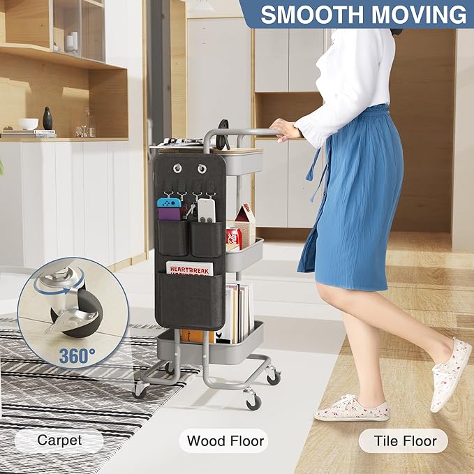 DTK 3 Tier Metal Utility Rolling Cart with Table Top and Side Bags, Tray Storage Organizer Wheels, Art Craft 4 Hooks for Kitchen Bathroom Office Living Room(Grey)