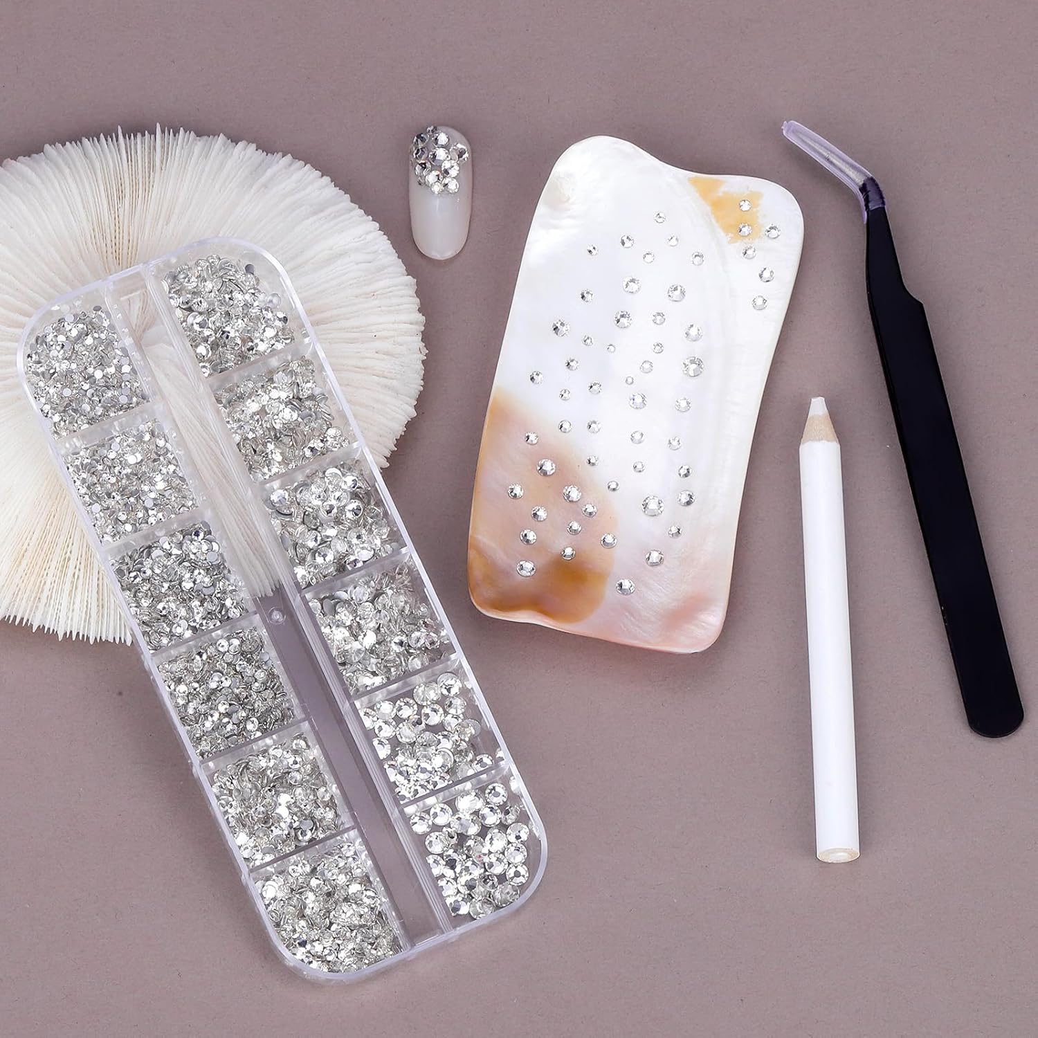 - ๐ใPackageใ1 Box of White Rhinestones (6 sizes); 1 Box of Beige & White Half Round Pearls (6 sizes);2 Boxes of Mirco;1PCS of Picker Pen and 1PCS of Tweezer.