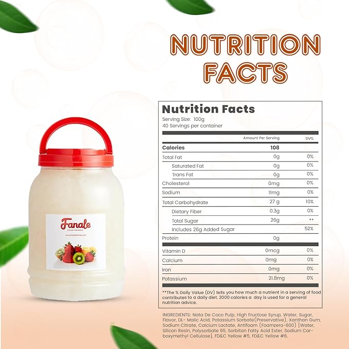 - 𝐒𝐰𝐞𝐞𝐭 𝐚𝐧𝐝 𝐄𝐱𝐨𝐭𝐢𝐜 𝐅𝐥𝐚𝐯𝐨𝐫: Each Fanale coconut jelly boba tea variety is infused with sweet and exotic flavors that complement a range of recipes. This nata de coco jelly topping includes strawberry, lychee, blueberry, mango, sakura, green apple, coconut, Konjac, and coffee flavors, adding a distinct and delightful twist to your creations.