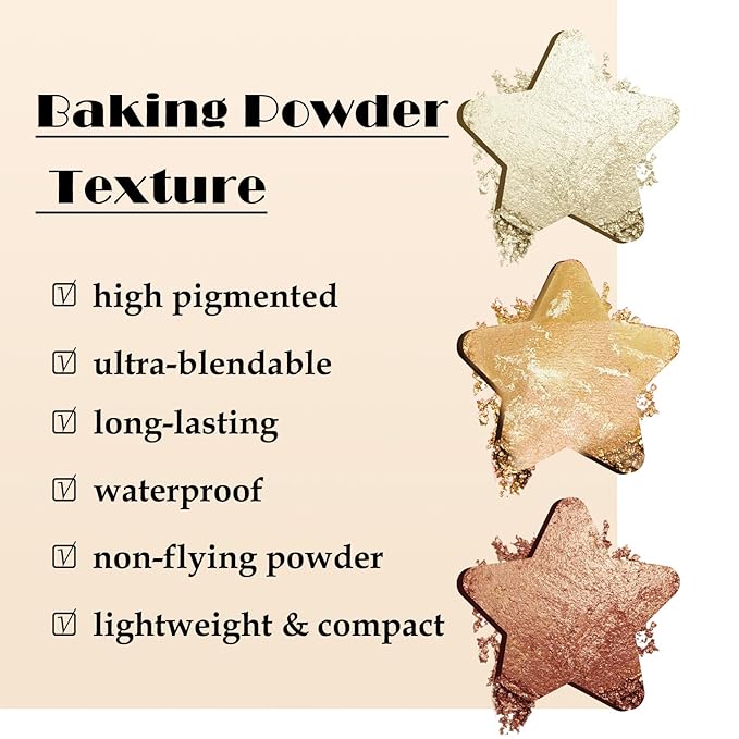 - Baked Highlighter & Blusher: Creamy fine and no fly powder, blendable blush baked powder with natural glow to brighten cheeks for glowing that shape, contour and highlight your brilliant three-dimensional facial features.