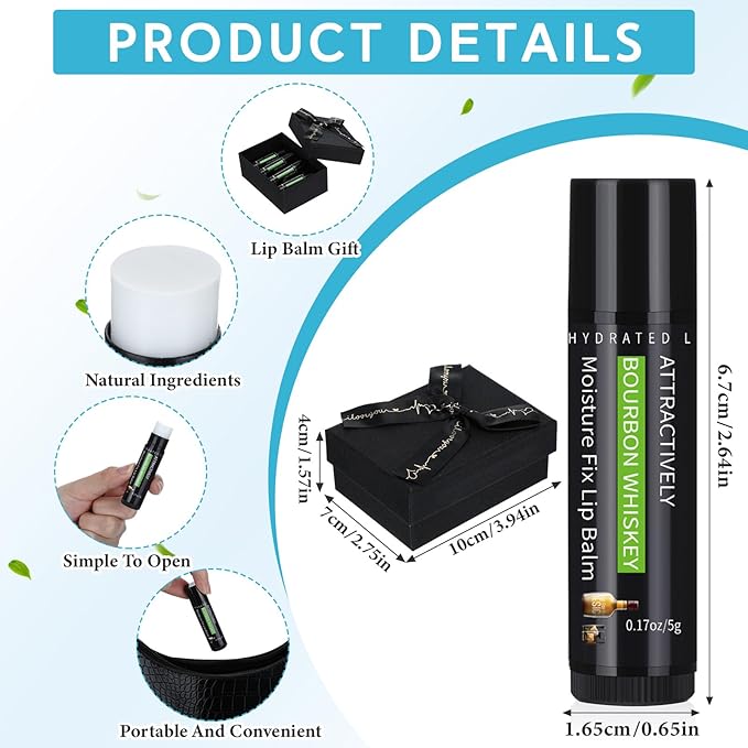 - Creative Bourbon Flavor: this bourbon lip balm not only has a fresh, uplifting aroma, but it also leaves a cooling sensation on your lips, providing instant relief from dryness and chapping, ensuring your lips stay soft, smooth, moisturized and healthy; Especially suitable for dry, cracked or chapped lips