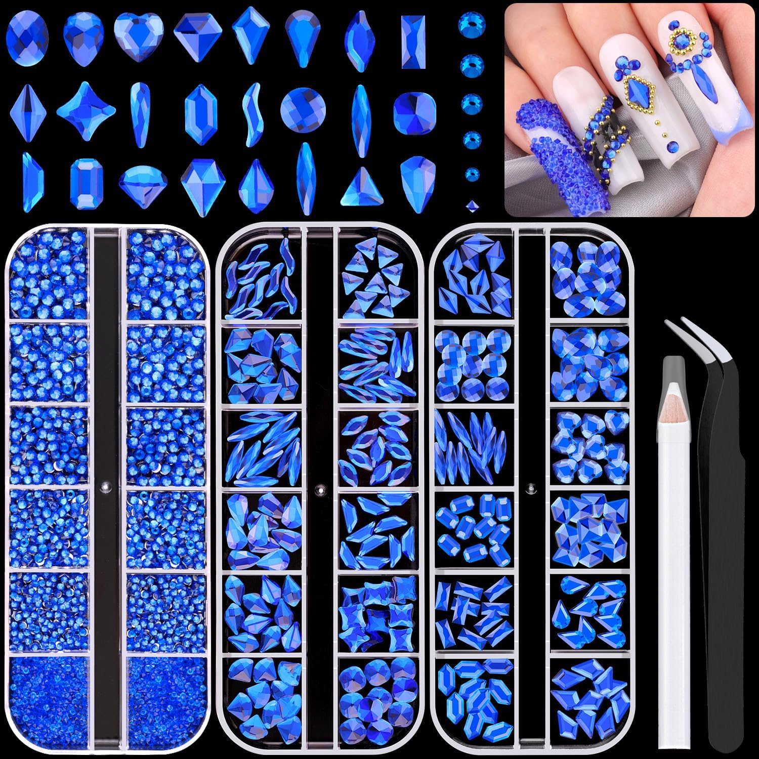 - đź’ŽPACKAGE CONTENT -- The package contains 240Pcs multi shapes flatback gems crystal and 2510Pcs 1.5-4mm round beads, totally 2750Pcs Royal Blue rhinestones. Additionally, 1 tweezers for large size gems and 1 pickup pen for small size gems. This rhinestones kit makes it easy for you to make any nail art you like, and will bedazzle your acrylic nails!