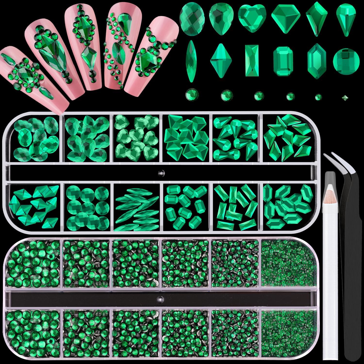 - đź’ŽPACKAGE CONTENT -- The package contains 120Pcs multi shapes flatback gems crystal and 2510Pcs 1.5-4mm round beads, totally 2630Pcs Emerald Green rhinestones. Additionally, 1 tweezers for large size gems and 1 pickup pen for small size gems. This rhinestones kit makes it easy for you to make any nail art you like, and will bedazzle your acrylic nails!