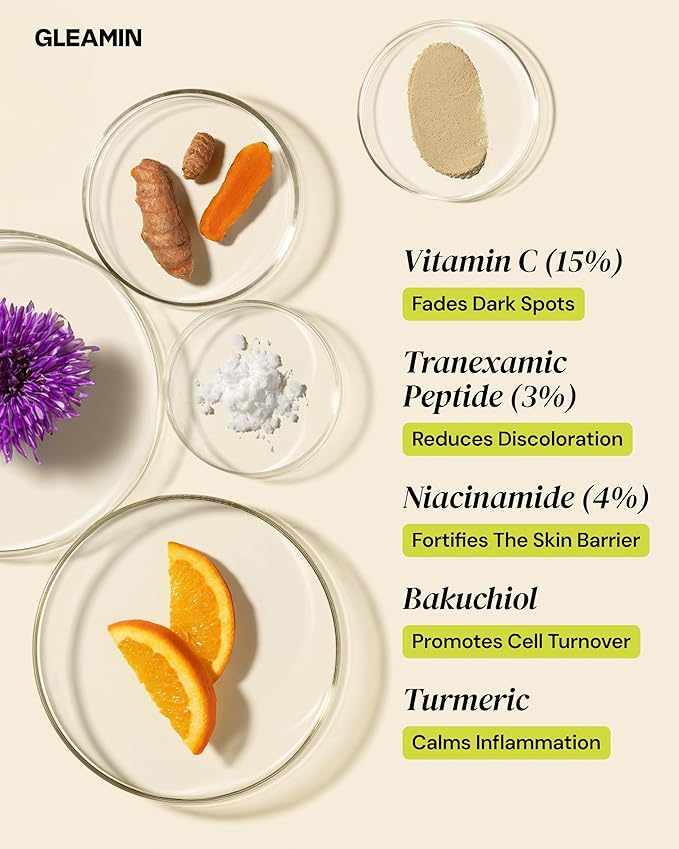 - Powerful Brightening Formula: This Vitamin C Facial Serum blends 15% Vitamin C with 3% Tranexamic Peptide and Turmeric to visibly fade dark spots, even skin tone, and restore radiance for glowing skin.