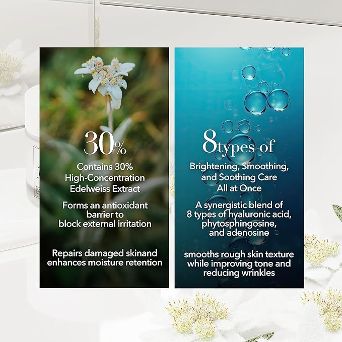 - Deep Hydration for Your Skin’s Glow: Infused with 30% Edelweiss extract and 8 types of hyaluronic acid. Deeply hydrates and restores even the driest skin, leaving it soft, smooth, and glowing