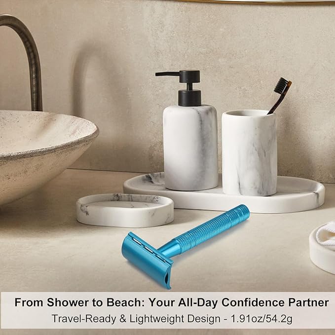 - Travel-Ready & Lightweight Design: Perfect for on-the-go grooming! Weighing 30% less than standard metal safety razors, this compact safety razor fits perfectly into any toiletry bag or suitcase. Making it ideal for travelers and eco-conscious adventurers. Perfect for gifting to family or friends who value zero-waste lifestyles