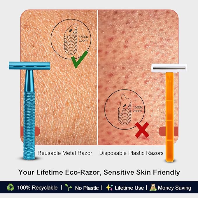 - Eco-Conscious & Built to Last: Shaving with our reusable metal safety razor - a zero-waste essential for eco-friendly shaving. Crafted from long-lasting, fully recyclable metal, this vintage-inspired double edge razor saves money and reduces environmental impact. With the right care and maintenance, it can last a life, aligning with sustainable lifestyles. (No parts to replace, just replace standard safety razor blades) Change the way you shave, choose our single blade razors for men and women