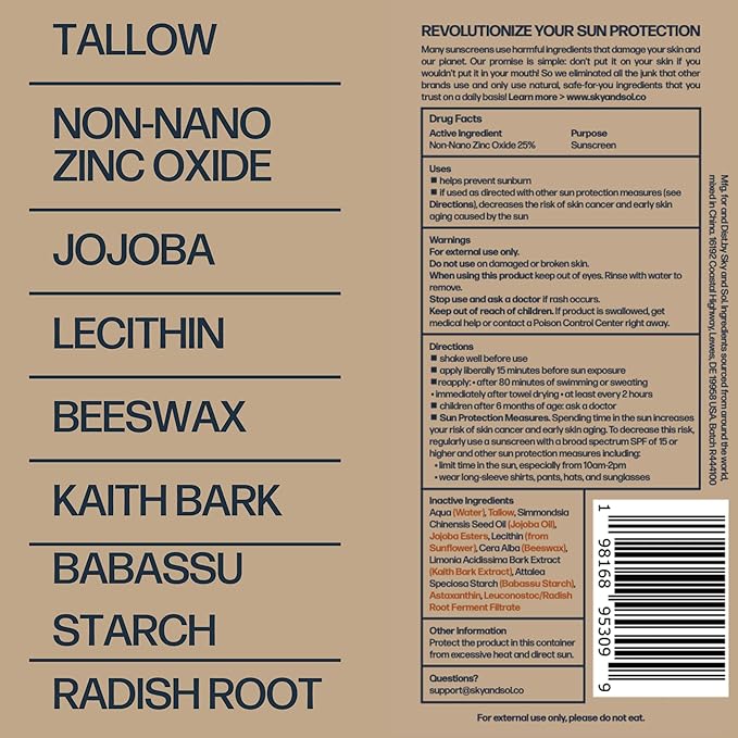 - Nourishing Animal-Based Skincare with Beef Tallow: Embrace the healing power of beef tallow, which nourishes and protects your skin. Sky and Sol offers effective sun protection while promoting skin health and vitality, making it the perfect everything cream for your skin.
