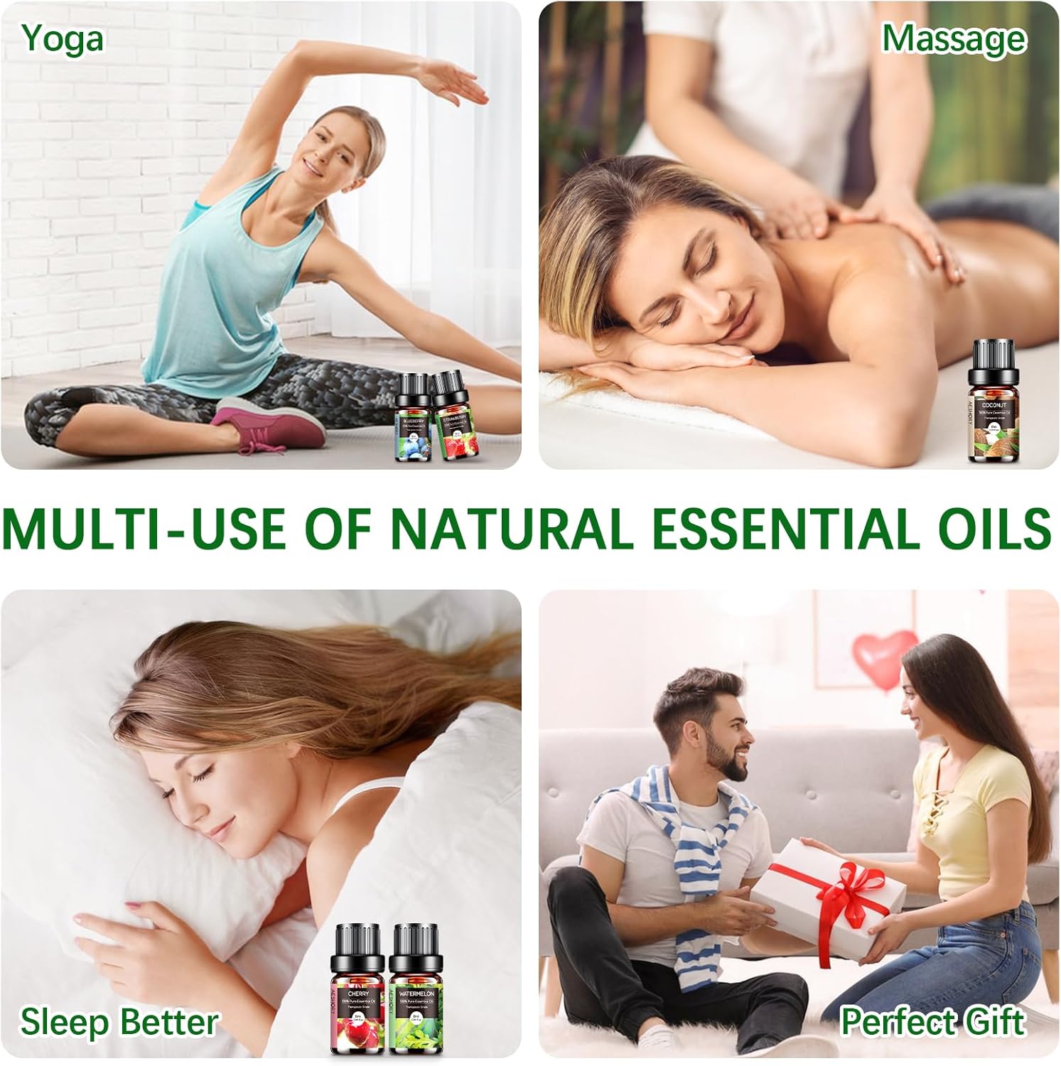 - ๐ฅฅใMultiple UsesใThese essential oils can be used for aromatherapy, diffuser, massage, skin & hair care. Simply add a few drops to any diffuser and fill your entire room with that aroma, suitable for home care (large room, bedroom, living room, bathroom), office, outdoors, campground, yoga room and spa for a whole day relaxation.