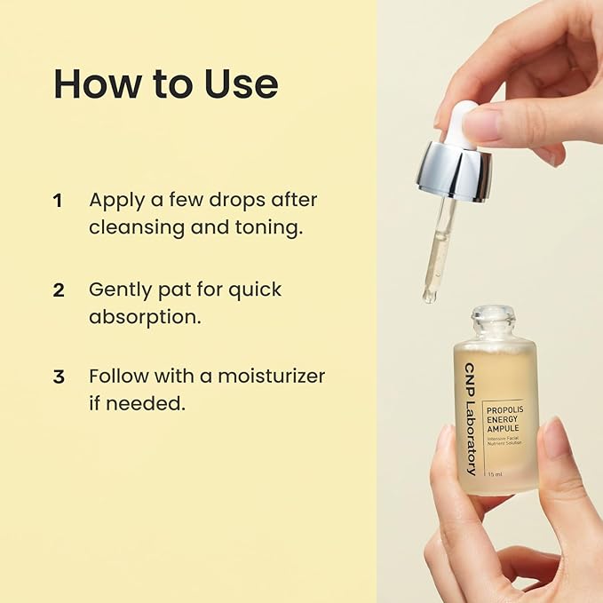 - [PROPOLIS AMPULE] CNP's No.1 steady seller since 2005. It is a facial ampoule infused with two types of propolis extracts, providing deep hydration and a healthy glow to your skin. Comes in a 0.5 fl. oz / 15ml bottle.