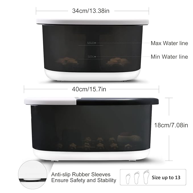 - 【Fast Heating & Intelligent Temperature Control】MoodRelish Foot Spa Bath Massager with Heat Bubbles and Vibration Massage and Jets can heat up water efficiently and maintain water at selected temperature (95-118°F). Its 500W PTC Heater is with safe and secure multi-insulation protection and overheating protection, so you needn't worry about the safety. For Home Footbath, soaking feet in MoodRelish foot bucket can not only enhance the therapeutic effect, but also help relieve fatigue, swelling & redness.
