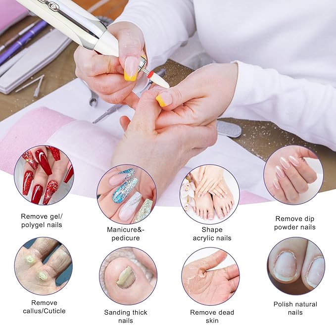 - 5.Multi-Functional Wireless Nail Drill Machine:This efile nail drill handles grinding,carving,cutting,and polishing for toenails and adults natural nails.It is a professional E file,manicure tools,nail grinder.