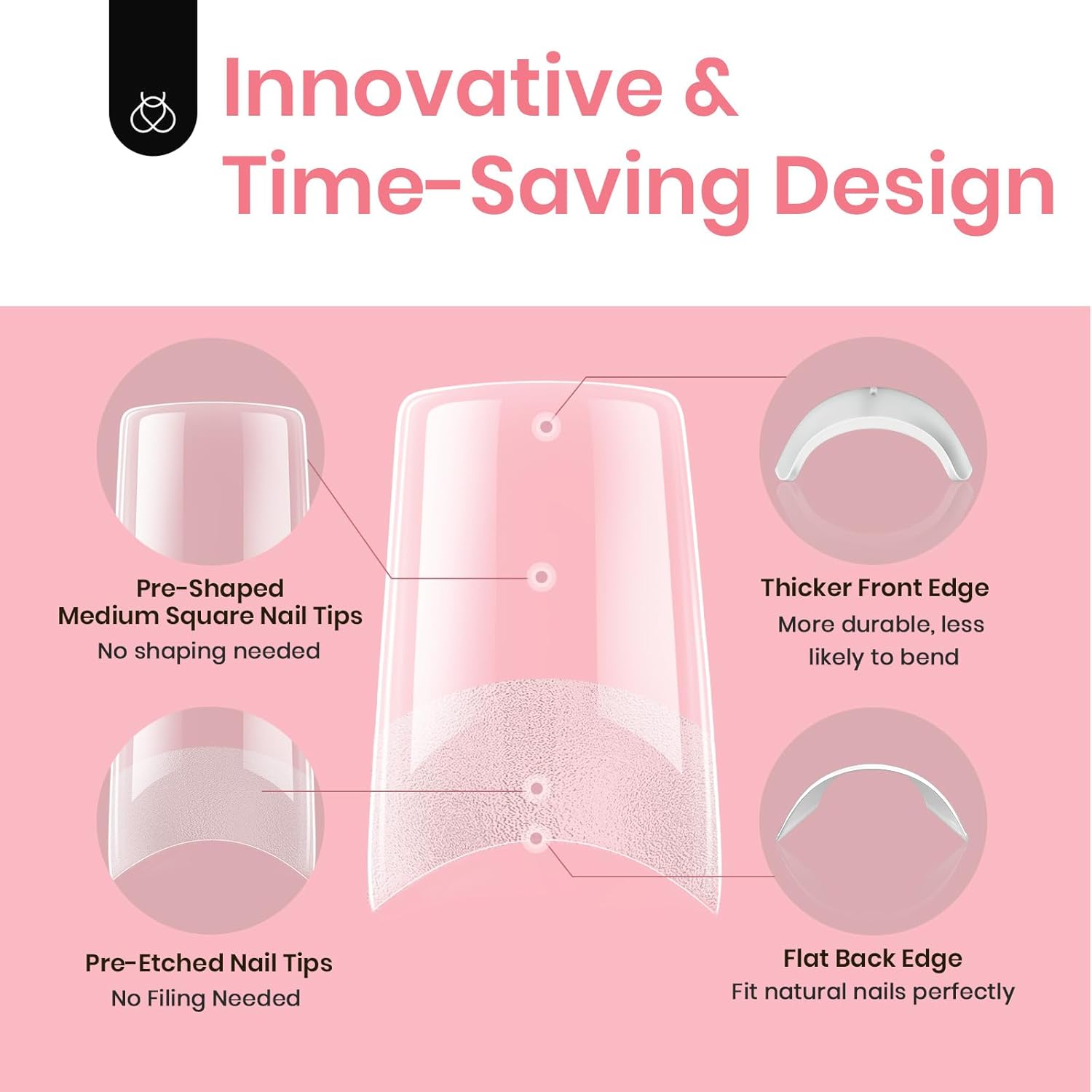 - Easy Application with 10ml Nail Glue: Medium square nail tips come with a 10ml bottle of fast-drying nail glue, ensuring hassle-free and secure application for beginners and professionals alike. These half-cover, nail tips are great for creating trendy, custom nail designs like French tips, ombrรฉ effects, or intricate nail art.
