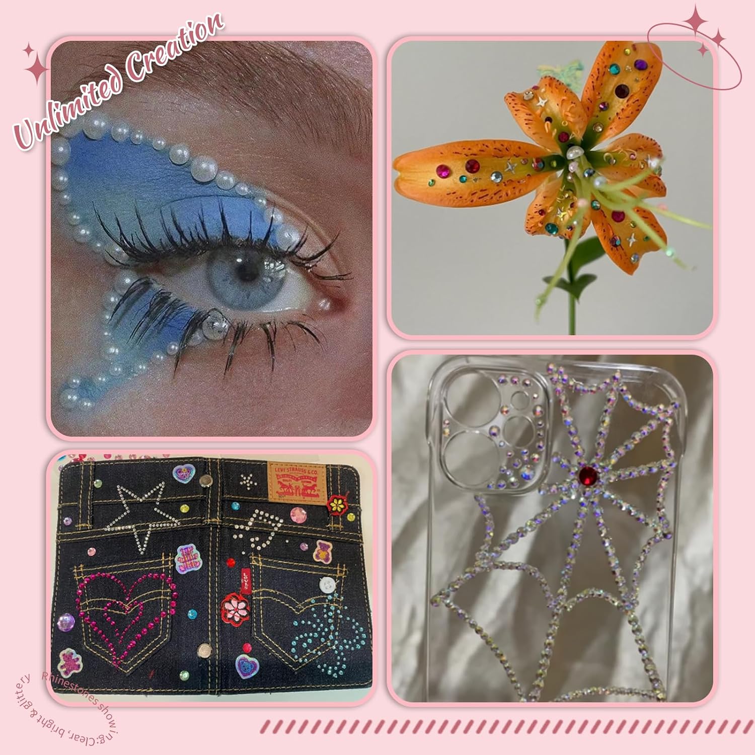 - Wide Use: Flatback rhinestones and flack back pearls can not only be used for nail decorations, but also for eye makeup, body art, phone cases, bags, shoes, greeting cards, jeans, clothes, invitations, glasses, cup, wedding dresses and other artworks, etc
