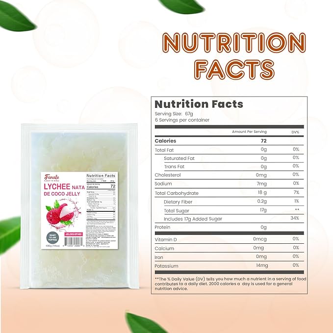 - 𝐍𝐮𝐭𝐫𝐢𝐭𝐢𝐨𝐮𝐬 𝐈𝐧𝐠𝐫𝐞𝐝𝐢𝐞𝐧𝐭𝐬: Our nata de coco jelly topping is made from the inner layer of coconut meat, making it delicious and nutritious. The coconut boba tea jelly topping retains many vitamins, minerals, and fiber inherent to coconut, making it a healthier option than many artificial or processed toppings.