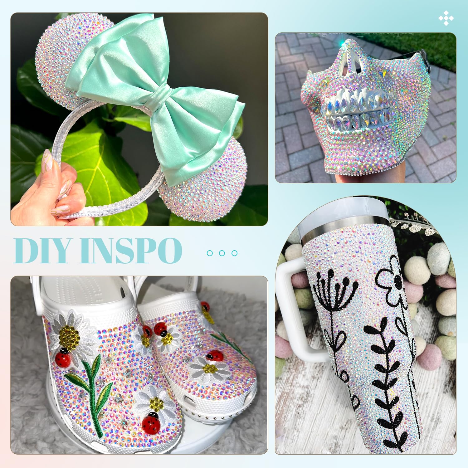 - 💎WIDE APPLICATION -- These sparkling iridescent resin crystals are perfect for creating dazzling looks. Use them for bedazzling DIY crafts like shoes, tumblers, mugs, bottles, phone cases, popsockets, scrapbooks, photo frames, diamond paintings, greeting cards, bags, glasses, guitars, keychains, hats, masks, hair clips, bracelets, wristbands, clothing, wedding dresses, and more. Apply it to what you want to bling!